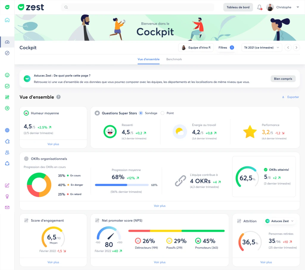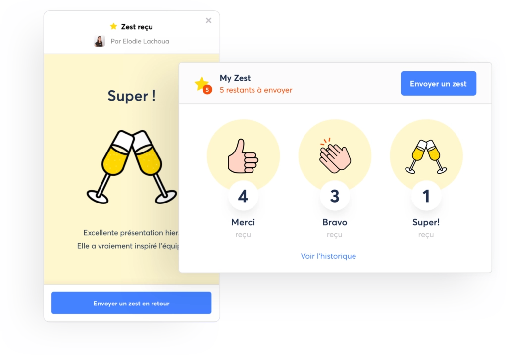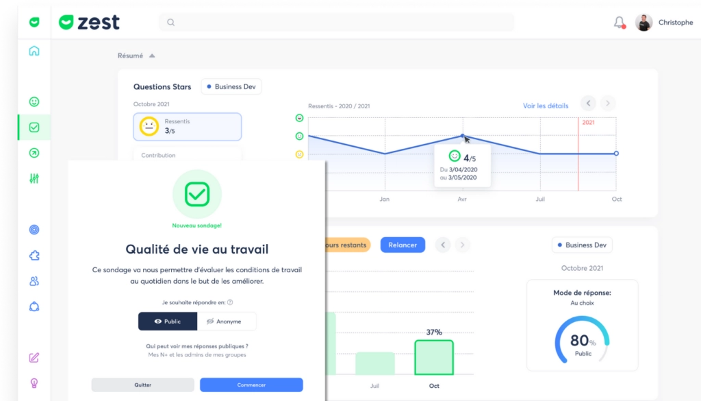 Employee engagement is not static; it relies on modifiable factors throughout the year. With ZestMeUp, you centralize the management of these factors in real-time and ensure that you remain constantly at the heart of your teams’ lives.