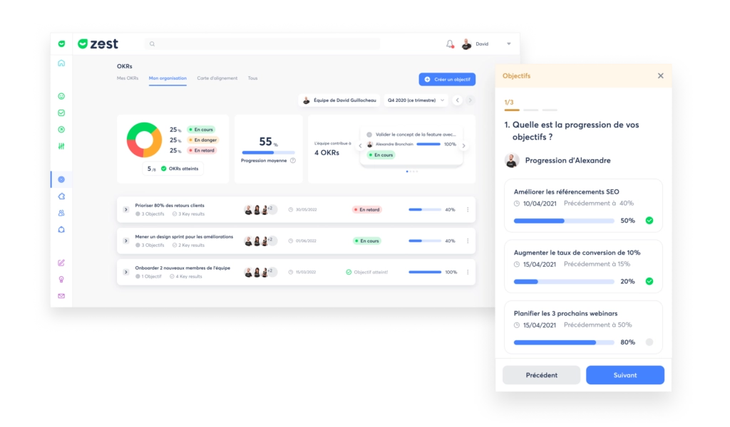 Thanks to the 360° view of your activity and the identification of your teams’ main performance indicators by the ZestMeUp solution, it is easier for you to adapt your company strategy and your HR strategy in response to field feedback. By monitoring your teams’ progress in their various projects, you can easily prevent risks through preventive actions at the manager and human resources levels. With ZestMeUp, you can also communicate transparently about your company’s current mission and track the deployment of teams at all levels of the company to achieve it.