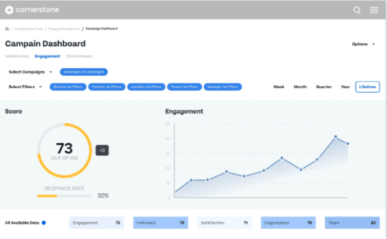 For many organizations, aligning goals means each team is accountable for ensuring key performance indicators such as turnover, profitability and productivity are met. Cornerstone can provide actionable insights for mangers to drive the business strategy and for HR to put the right learning and development initiatives in place.