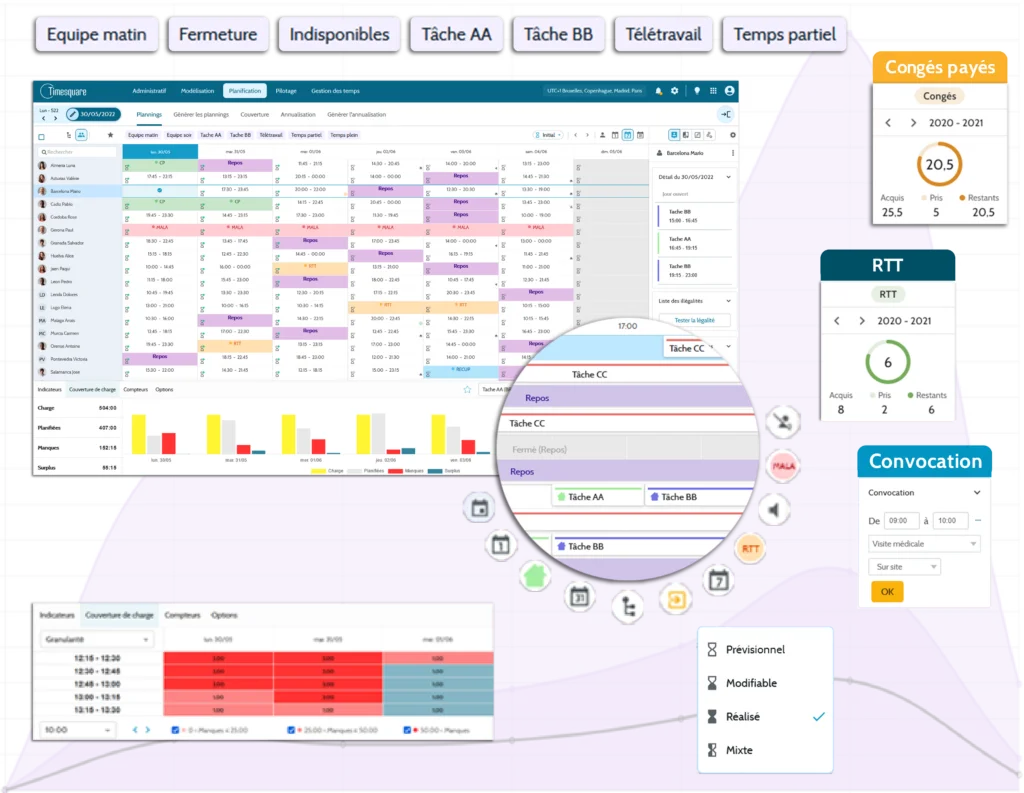 With Timesquare, structure your company’s organization around daily schedules optimized to promote an optimal work-life balance and reconcile employee engagement with customer satisfaction. Comply with regulations without compromising the efficiency of your teams.