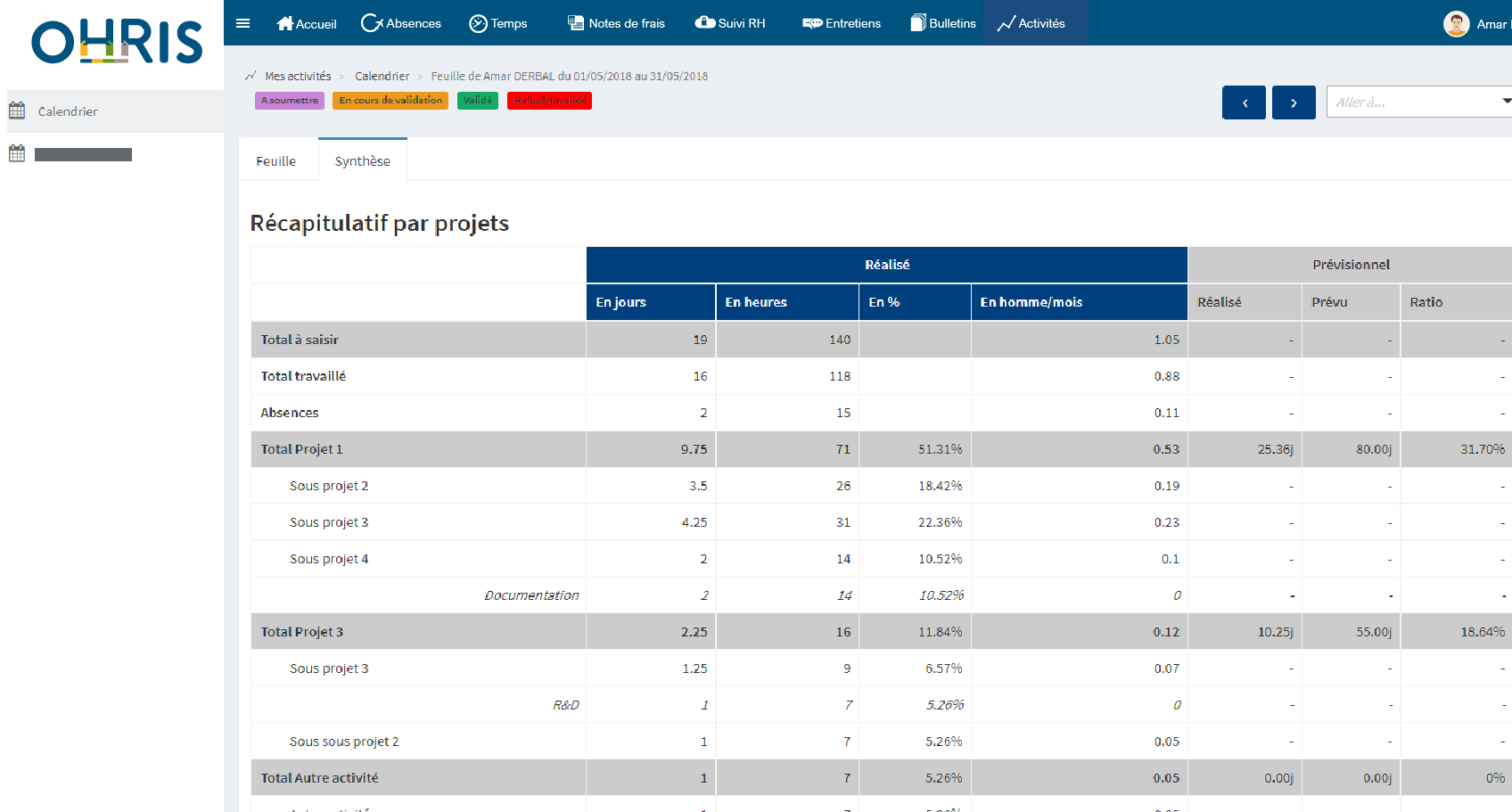oHRis Activity Tracking facilitates the management of your various projects with its automated calculation engine, which allows you to report the time spent per project, task, team, or even by funder on demand. You will also have the option to track not only past activities but also the status of forecasts in days. oHRis Activity Tracking also allows you to keep an eye on your budget and extract all costs related to ongoing activities.