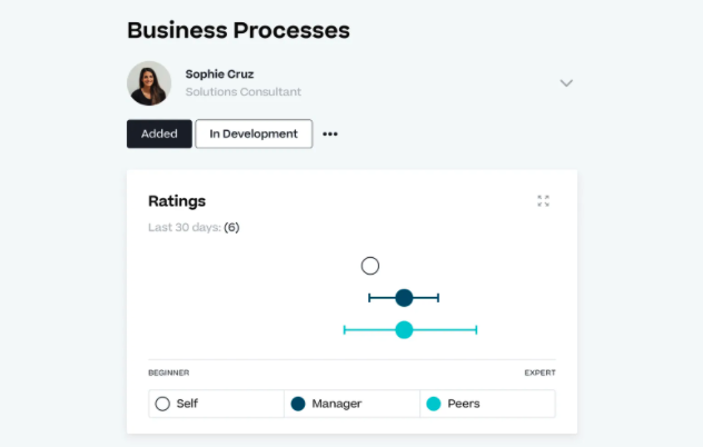 This includes the ability for managers to see and compare the skills of an individual in terms of ratings and development level in each skill. This view makes it easy to start a development conversations with your employee. It also allows employees to use this information for self-reflection and calibration.