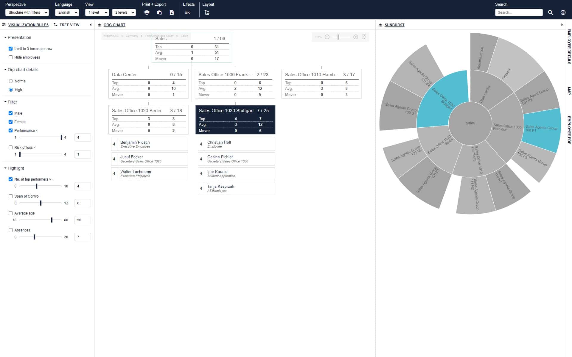 With Ingentis org.manager, you transform your HR data into an invaluable basis for your business decisions. By visualizing information in various forms, the solution enables a holistic overview as well as an in-depth analysis of your organization.