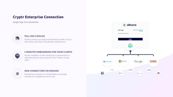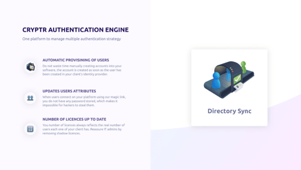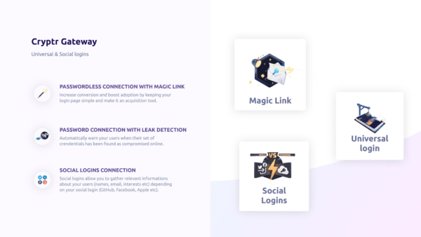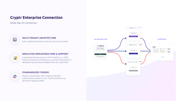 Cryptr propose des solutions d’authentification permettant aux SaaS et sites webs de proposer rapidement la méthode d’authentification la plus adaptée à leurs utilisateurs. En permettant aux clients d’externaliser tout ou partie de leur système d’authentification Cryptr leur permet de se concentrer sur des fonctionnalités à plus forte valeur ajoutée.