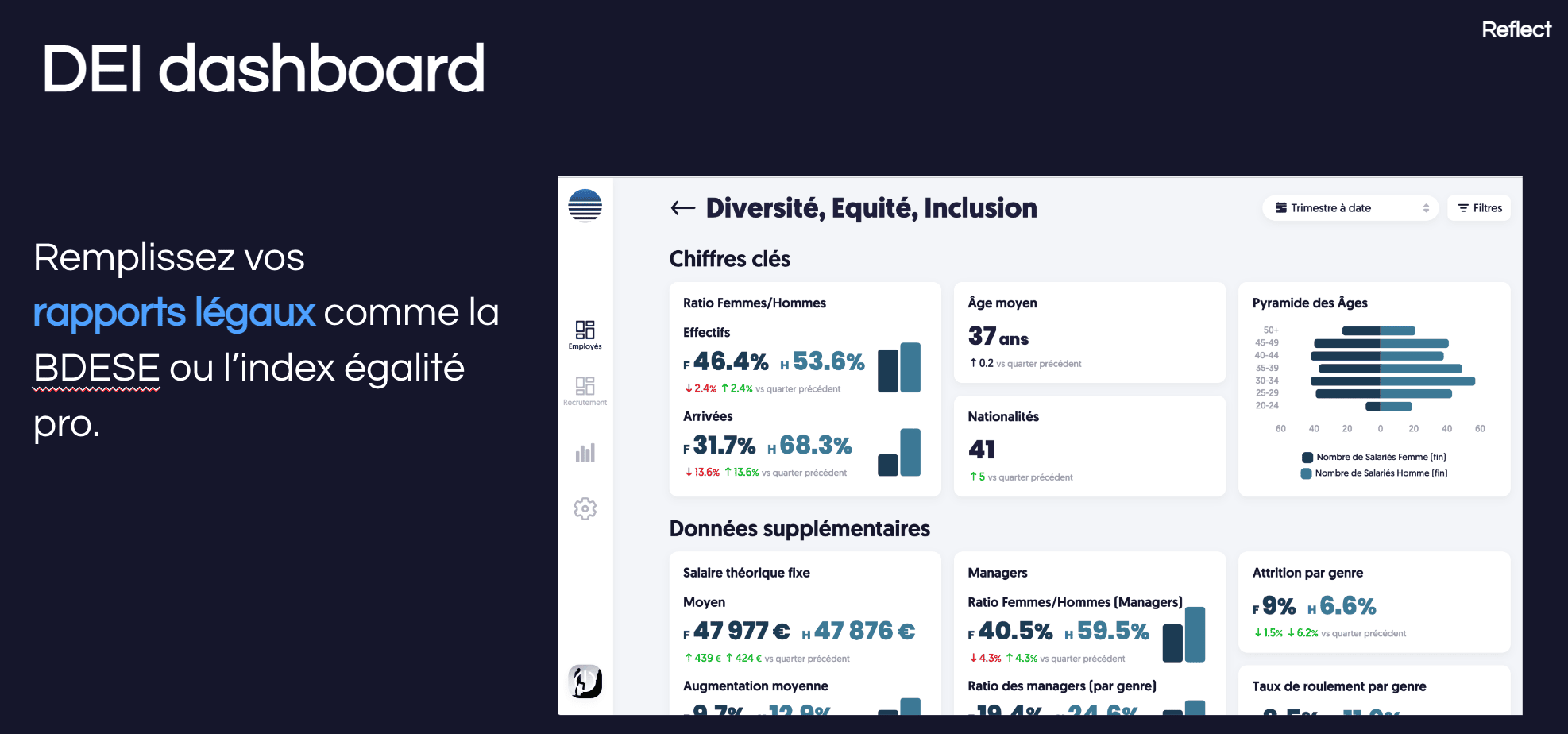 Reflect est la solution d’analytics RH, en temps réel. Vos équipes sont submergées par la création, gestion et fiabilisation de vos indicateurs RH (recrutement, évolutions de carrière, calcul de turnover…) ? Vous faites face à des obligations réglementaires (BDESE, Index Egapro…) qui vous prennent du temps. L’accès et la visualisation de vos données RH en temps réel est primordiale.