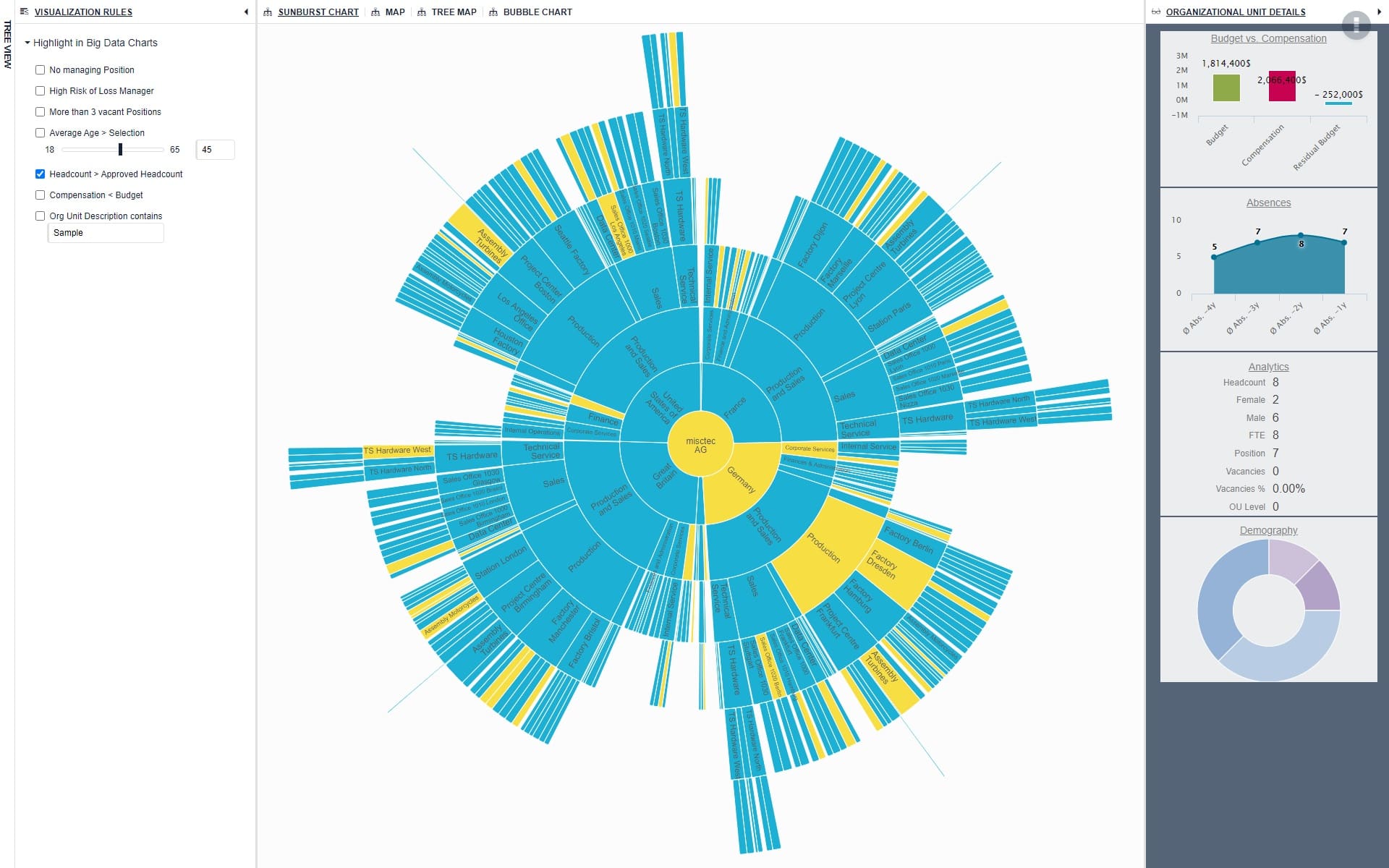 En plus de visualiser votre structure organisationnelle et les indicateurs clés associés de manière simple à comprendre, Ingentis org.manager vous permet également de définir des règles de visualisation personnalisées pour vous concentrer sur des aspects particulièrement importants. Mettez en évidence, par exemple, les étendues critiques de contrôle ou les unités organisationnelles qui dépassent leurs budgets alloués pour effectuer les ajustements nécessaires et optimiser les performances de votre entreprise.
