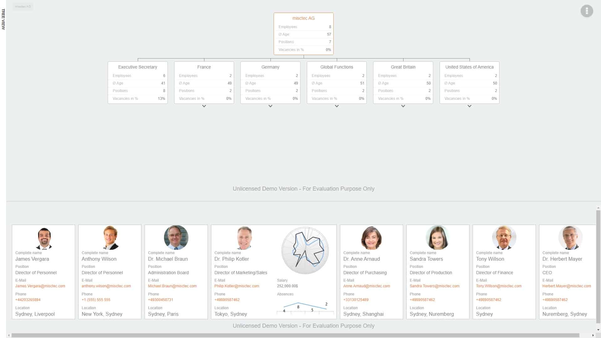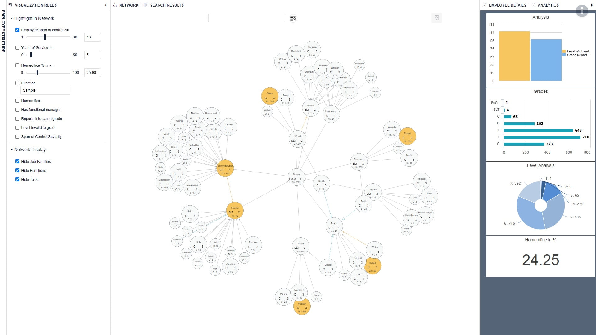 La solution logicielle fournit des informations importantes nécessaires pour vous permettre de prendre des décisions commerciales fondées. Il n’affiche pas seulement la situation actuelle, il offre également la possibilité de modéliser les changements structurels et de voir et d’évaluer leurs résultats potentiels. De cette façon, vous n’avez plus besoin de prendre des décisions basées sur l’intuition, mais vous pouvez vous fier aux faits et aux chiffres. Une meilleure collaboration grâce à une plus grande transparence pour que chacun trouve l’information qu’il recherche. Qu’il s’agisse de responsabilités, de lignes hiérarchiques ou de coordonnées, la fonction de recherche complète répond à toutes ces questions en quelques secondes.