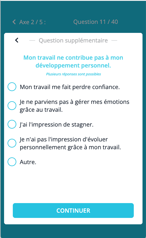Gagnez du temps dans la mise en place de votre enquête avec plus de 30 modèles conformes (ANACT, Karasek, Gollac…) et personnalisables pour que votre questionnaire soit aligné avec les objectifs de votre enquête.